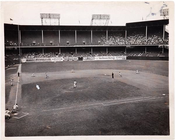 Vintage photo of Ebbets Field during a playoff game between the Pittsburgh Pirates and the Brooklyn Dodgers. Image shows Stan Rojek of the Pirates slapping a double that drove in the winning runs in this protested game. Photo is 15" x 12" with some ink marks in the upper right corner as well as some creasing. Overall VG-EX.