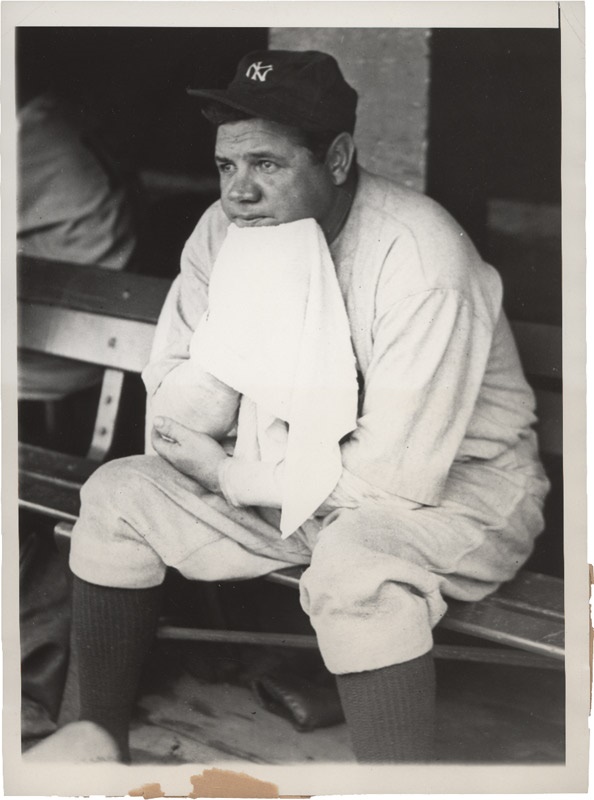 A pensive Babe Ruth is sitting in the Yankee dugout holding a towel in this 6" x 8" photo from the 1930's. It is an AP wire photo and is in EX condition. The caption sheet has been torn off the back side.