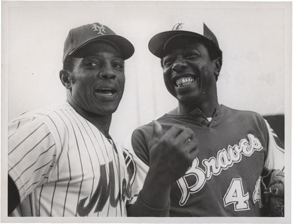 Super photo of home run sluggers Henry Aaron and Willie Mays. News service wire photo is 7" x 9" and in EX-MT condition. Caption is taped to the back. Image is of a jovial Aaron who has just passed Mays in total home runs and is only months away from breaking Babe Ruth's all time HR record of 714.