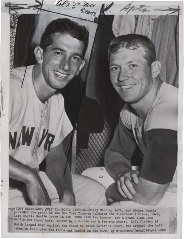 Great, post-game, locker room photo of smiling Yankees Billy Martin and Mickey Mantle. Wire photo was taken on July 31, 1956 after a 13-6 Yankee victory over the Cleveland Indians. Photo is 8" x 10", in VG condition with newspaper edit markings along the top side. Newspaper clippings are taped to the back. Martin had three hits including a home run that left fielder, Al Smith, leaped over the fence to catch, only to fall over the fence and drop the ball on the other side. Mantle drove in six runs on two homers, including a grand slam.