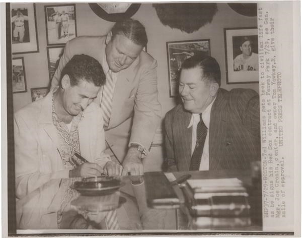 News service wire photo of Ted Williams signing his post military service contract with Red Sox owner Tom Yawkey and manager Joe Cronin. Photo was taken on July 31, 1953. It is 7" x 9" and slightly faded with some small creases. Overall a great photo and in EX condition.