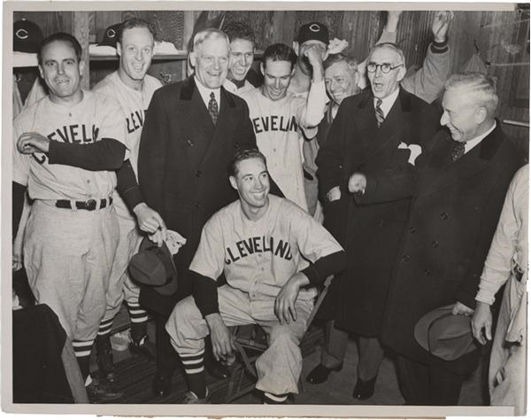 Jubilant post game locker room photo of a young Bob Feller, surrounded by Cleveland Indians teammates and ownership after hurling a no hitter on opening day against the Chicago White Sox. Photo was taken April 16, 1940. It is 7" x 9" and in EX plus condition. News service caption is taped to the back side.