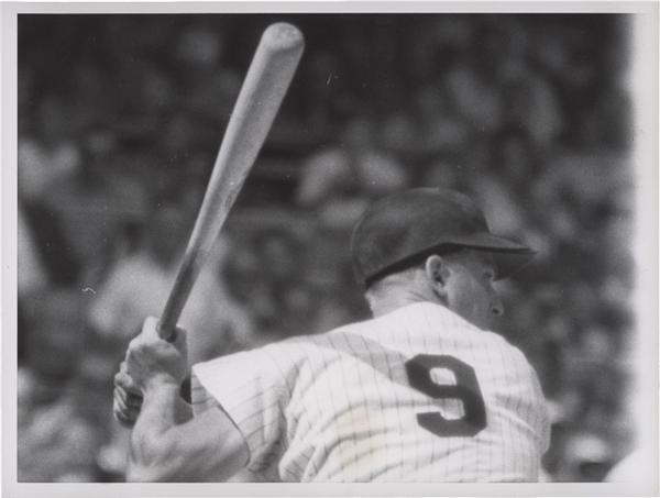Photo measures 7" X 9 1/8". Roger Maris pictured in his batting stance. Photo shows close up of his grip from behind with his number 9 and pinstripes. Faint scratches horizontally across photo and small yellow mark on the left side of his back. Typed caption sheet taped to the verso. Stamped date on back "October 30 1961". Overall photo in excellent condition.