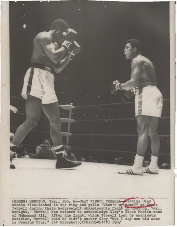 Two wire photos measuring 7 3/4" X 9 7/8" and 10 1/8"X 8 1/8". The first is an action sequence of three photos of Cassius Clay landing a punch on Ernie Terrell. The second photo depicts Cassius Clay yelling "What's my name?" at Ernie Terrell. Cassius Clay is circled in red ink in both photos. The sequence shots have the right bottom corner torn off and some scratches and smudges across parts of the photo. The second photo has a few creases throughout. Overall the photos are in good condition.