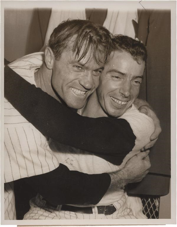 Associated Press Photo depicting Joe DiMaggio hugging Hank Bauer in the locker room after the last game of the 1951 World Series against the Giants. Photo measures 7 1/4"X 9" with a small 1/2" pen mark in top right corner. Typed caption sheet affixed to the verso. Overall photo in EX-MT condition.