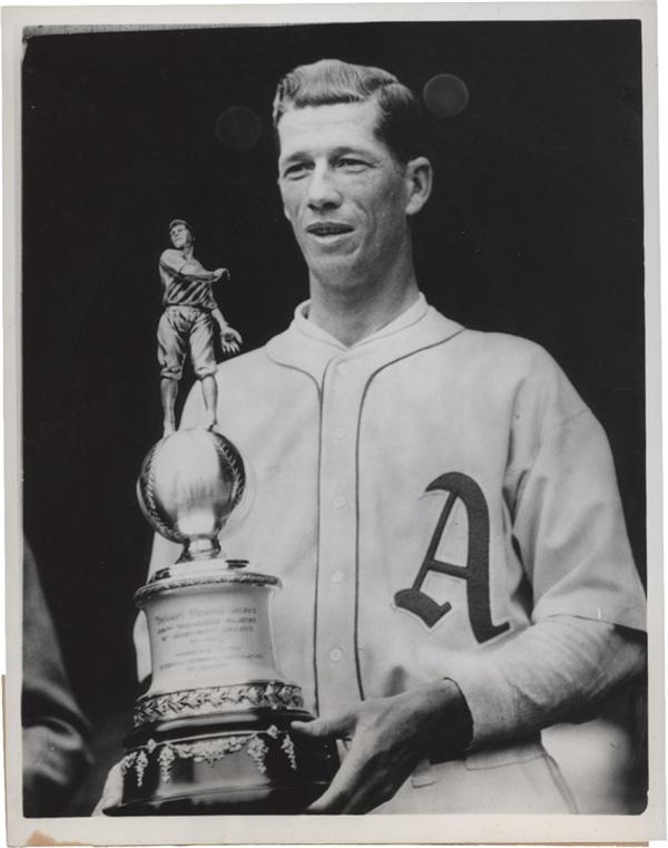 Lefty Grove is showing off his "Outstanding Player in 1931" trophy in this wire photo that measures 7 1/4" x 9. "World Wide Photos" stamp and paper caption are found on verso. A slight crease runs about 7 inches long along the right side of photo, but is not easily seen. Overall, photo in EX-MT condition.