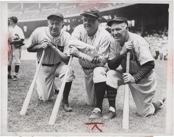 The three baseball icons are pictured kneeling and leaning on their bats on July 28, 1941 in Cleveland, Ohio for the Cleveland Baseball Federation's Annual Amateur Day. Photo measures 7 1/8 x 8" with a glossy finish and stamped on the verso, "Wide World Photos". The original caption sheet remains affixed to verso, hanging at the bottom. Red editor marks are visible on the bottom center of photo, red smudge marks are on the top center and left side and a half inch crease is in the bottom left corner. Overall, image is in very good condition.