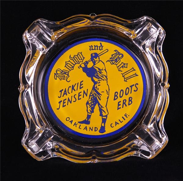 1958 AL MVP and 1959 gold glove winner Jackie Jensen is featured on this rare Bow and Bell, Oakland, CA restaurant ash tray. It is approximately 4" square and is in NRMT condition. Jensen played most of his career for the Boston Red Sox.