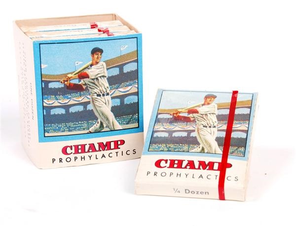 Ted Williams black market Champ Prophylactics unopened packs, set of four packs, three per pack, with scarce outer sleeve. Outer sleeve is 1 3/4" x 2" x 1 1/2" in three dimension holding the four packs. Manufactured by National Hygienic Products Corp., New York in the 1950's. These were most certainly unauthorized by the Splendid Splinter but bear his image.