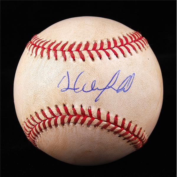 This single signed Official AL game ball (Brown) is signed by Dave Winfield on the occasion of his 3000th Major League hit. It is game used on September 16, 1993, when Winfield's Twins were playing the Oakland A's. Winfield obtained the milestone hit off of Oakland reliever Dennis Eckersley. Off white ball shows nice game use. Signature is in blue ball point ink on the sweetspot and is a solid 9-10. Comes with LOA signed by Major League umpire Dave Phillips and a COA from PSA/DNA.