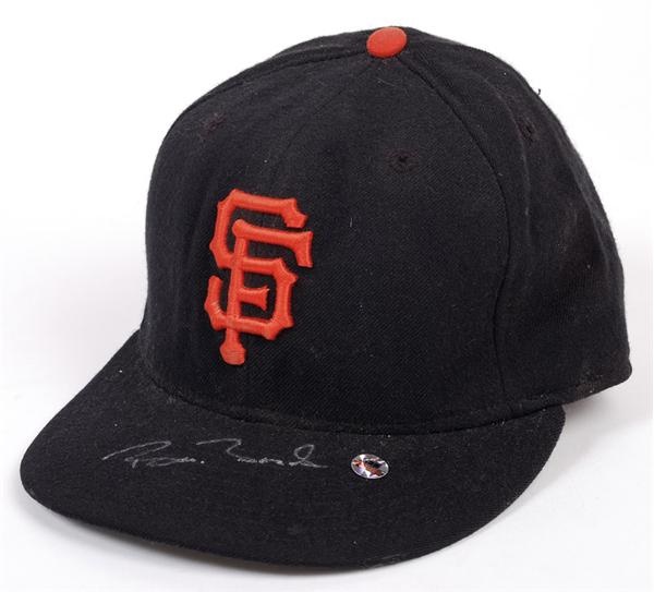 Barry Bonds is now the all time home run king, having just surpassed the great Henry Aaron on the all time list. This is his game worn SF Giants baseball cap. It is made by New Era, authentic Diamond Collection, is a size 7 1/4, 100% wool, Made in USA. His #25 is written in worn black marker under the brim. His autograph is on top if the brim. Hat is shows great game use.