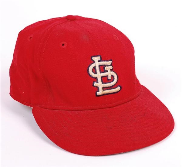 HOFer Lou Brock was one of the best base stealers in baseball history and collected over 3000 hits in his ML career from 1961-1979. He played for the Cubs his first several seasons, then was traded to the Cardinals where he played for 16 seasons. This is his game worn hat made by New Era and has his #20 written under the brim and his autograph on the top side of the brim. Signature is faded but legible. Hat shows good game use.