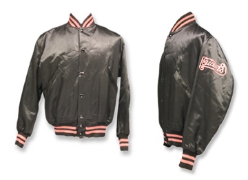 Player jacket is in the classic Giants color of black and orange. Embroidered "Giants" on the sleeve. The collar, cuffs and waist band are in the same color pattern of striped wool. Nice green quilted lining for the cold days of October in 1954, when Mays shocked the world with his famous catch. EX-MT.