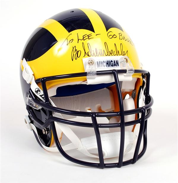 Bo Schembechler, legendary coach of the Michigan Wolverines, has signed this authentic Air football helmet. It reads “To Lee-Go Blue!” with the coach's signature just below. Autograph is on the front of the helmet. Mr. Schembechler coached the Wolverines from 1969 through 1989 and is a member of the College Football Hall of Fame. Helmet comes with COA from PSA/DNA.