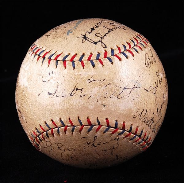 The 1924 New York Yankees were fresh off their first World Series victory in 1923 over the NY Giants. Official American League red and blue stitched Ban Johnson Baseball signed by 22 members of the team including Joe Buch, Waite Hoyt, Bob Shawkey, Herb Pennock, Wally Pipp, Joe Dugan, Ben Bengough, Sam Jones and Bob Meusel among others. It is off white in color with some fading and scrapes. Ball also includes Babe Ruth and M.J. Huggins "clubhouse" signatures. LOA PSA/DNA.