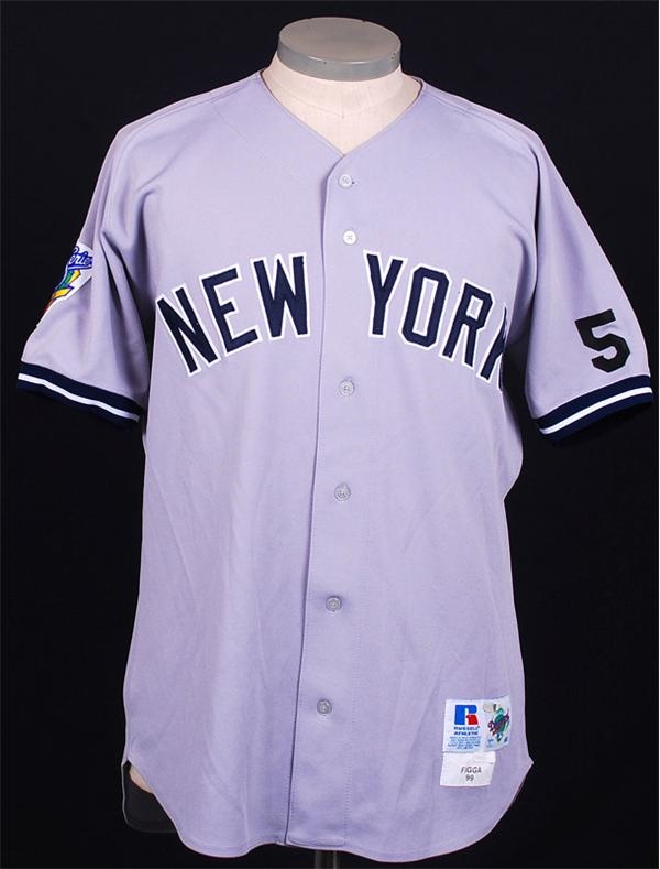 Jim Leyritz #13 1999 World Series game used New York Yankee road jersey. In 1999 Jim Leyritz hit the last Major League home run of the decade in game four of the World Series against the Atlanta Braves. This is a World Series game worn jersey with a special black #5 patch on the left shoulder in honor of Joe DiMaggio who died that year. The Yankees jersey is a Russell Athletic Diamond Collection jersey (size 48). Comes with a Yankees-Steiner LOA