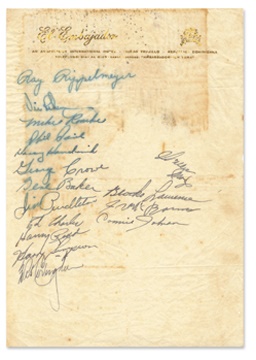 From Willie Mays' winter ball tour in the Dominican Republic following the 1962 season. D.R. Hotel stationery is signed by twelve major leaguers including Willie Mays in fountain pen ink. Other players include Rippelmeyer, Roarke, Crowe, Baker, Pendleton, Charles, Redd, Simpson, Covington, Lawrence, Barnes, Johnson & more. Water damage to the page does not affect the Mays signature, which is excellent.