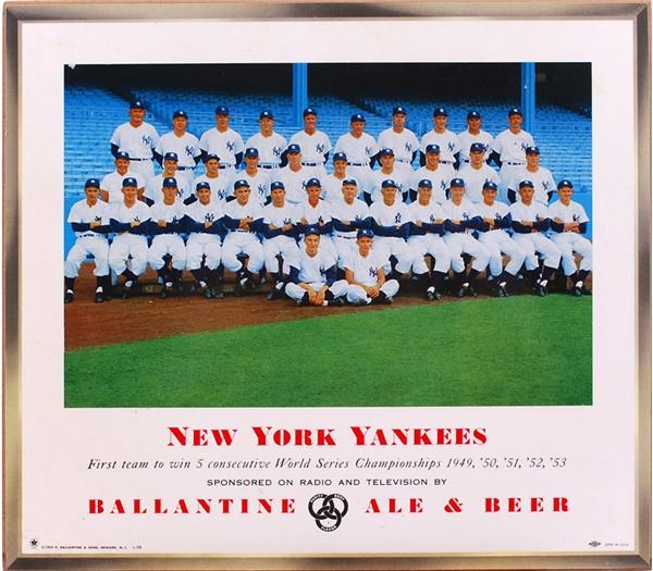 15.5 x 17.5'' colorful advertising piece issued by Ballantine Beer. 1954 Copyright date in the lower left corner. Pictured are Mickey Mantle, Bill Dickey, Casey Stengel, Phil Rizzuto, Billy Martin, Johnny Mize, Whitey Ford, and more. A few light scratches on the surface, still overall EX-MT.