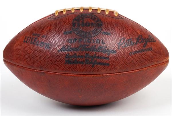 Official NFL (Rozelle) Wilson "The Duke" game used football. Marked with the number 118 in ink. Ball shows good game use. Also has the logo of Thorp Sporting Goods, New York.