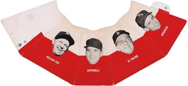 This was folded up and a ball set on top of it for display in sporting goods stores. The faces included on the box are Nelson Fox, Antonelli, Al Kaline and Aparicio. Two toned with white on top and red on bottom. White areas slightly toned due to use and age. Overall in very good condition.