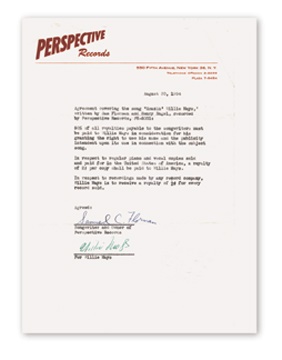 Not exactly a gold record Typed contract on "Perspective Records" letterhead agrees to pay a two-cent per album royalty (rip-off!) to the man who would make his famous catch a little over a month later. It is signed by Mays at bottom in perfect ink. But a pair of letters (included) to and from Mays' representative sings the blues, stating that they have "...sold less than 50 of the 'Amazin' Willie Mays' record and that royalties due Willie are under $1.00..." The Perspective Records exec concludes, "...Sorry that we won't be getting rich from this song--but it appears that baseball and music don't mix too well..." Some creasing and minor tearing, doing nothing to affect Mays' signature on the contract.