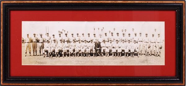 Panoramic team photo of the 1941 Philadelphia Athletics. Beautifully framed and matted to 13" x 29". Photo was taken on March 25, 1941 at spring training in Anaheim, CA. Seated in the center is HOF manager Connie Mack. Also pictured are Al Simmons, Kid Nichols and more. A few light vertical creases and some cracking on the surface. VG-EX.