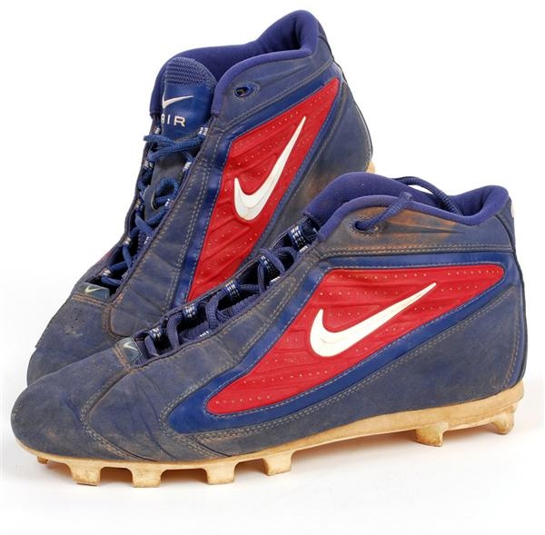 Vladimir Guerrero, one of major league baseball's best all around players, wore these baseball cleats during his time with the Montreal Expos. They are Nike, size 12's in Expo colors, with Guerrero's #27 on the back. There is writing in ball point pen on the inside tags. The cleats show plenty of diamond dirt and lots of wear to the cleat bottoms. Nice use!