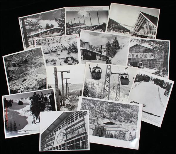 Collection of news service photos (55) of the construction and on site preparation for the 1960 Squaw Valley, CA Olympics. Photos are mostly 8" x 10" and include wire service captions taped to the versos. Conditions range from VG-MT. Includes images of several architectural renderings for buildings and venues as well as actual construction shots and finished buildings.