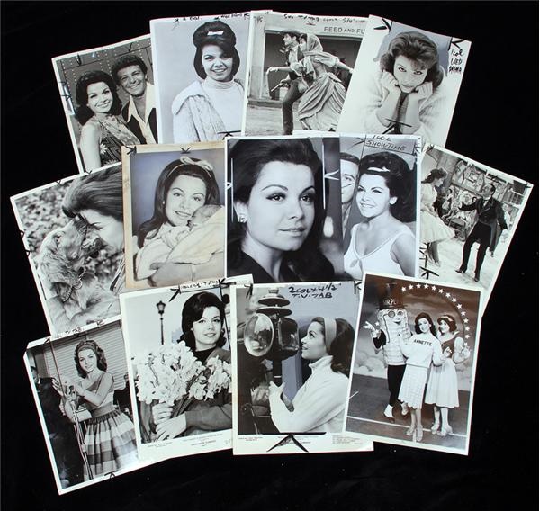Collection of wire and studio photos (21) of actress Annette Funicello. Funicello is best known for her roles on the Mickey Mouse Club as a child, and as Frankie Avalon's girlfriend in a series of 60's beach party movies. Photos are mostly in the 8" x 10" range and in VG-EX condition. Many have newspaper edit marks.