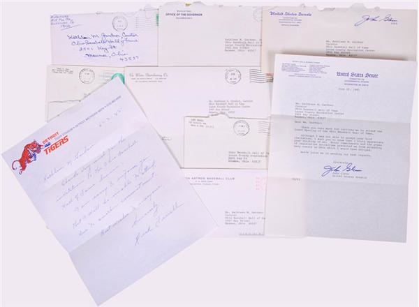 Collection of letters to the curator of the Ohio Baseball Hall of Fame from notable people including Bobby Brown, AL President on American League Stationary and Senator John Glenn on U.S. Senate Letterhead. Also included are letters from Luke Sewell, Mel Harder, Early Wynn, Ethan Allen, Bucky Walters, Al Rosen and Rick Ferrell on Tigers Letterhead. The Feller letters were signed by his wife. EX-MT.