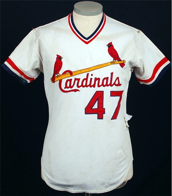 World Series worn Joaquin Andujar #47 1985 St. Louis Cardinals jersey. Andujar pitched for the Cardinals and had a 20+ win season that year. The Cardinals lost the "Show Me" Series to cross state rival Kansas City four games to three. This is a World Series game worn jersey. It is a Rawlings (size 42) with heavy game use. It is signed by Andujar in black marker on the #4 (of 47) and "World Series 1985" is written on the #7.