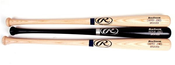 Andruw Jones and Chipper Jones of the Atlanta Braves, both swing Rawlings Adirondack Big Sticks at the plate. Here are (3) game issued baseball bats from 2001. (2) 34 ¾ " MS20's with Chipper Jones' name imprinted on the Barrel and handwritten in blue ball point on the knob end. (1) 34" 46OB with Andruw Jones' name imprinted on the barrel. The knob end is imprinted with the model number and "AJI01".