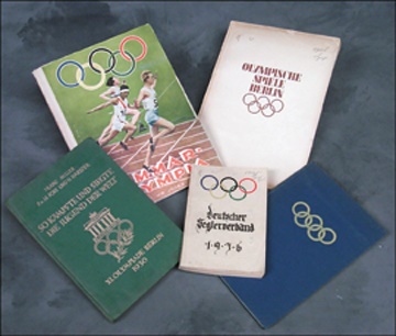 Superb group of books relating to the Hitler-Owens Olympics. 1) Olympische Spiele Berlin. 12x8" roughly 100-page softcover is all sepia photographic inside and includes several photos of the Jesse Owens exploits. VG-EX. 2) Sommar-Olympia. Translates to "Summer Olympics" with awesome full color cover of photo finish track race. 11.5x9" 112-page hardcover with beautiful images inside of the games and it stars (Owens included). EX. 3) Deutscher Seglerderband. Impressive travel guide to Berlin during the games is a 7.5x5" 244-page softcover with great info and photography inside. EX. 4) So Kampfte Und Siegte Die Jugend Der Welt. German book tells the games as the greatest show on earth. 10x7" 150+ page hardcover with great photos. 5) Winter-Olympia 1936. 10x7" 100+ page hardcover with great Olympic ringed cover. EX-MT. 6) Winter-Olympia. This is the winter games match #2. 11.5x9" 112-page hardcover with wonderful insides. EX.