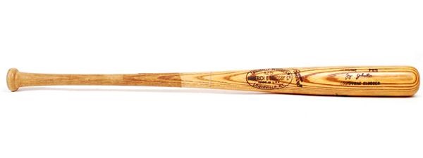 34.5" H&B P89 Jay Johnstone model game used baseball bat. Used sometime in the early 80's, this bat is signed by Johnstone's Dodger teammate, Dusty Baker. The bat shows good use with a cracked handle, old tape marks and plenty of ball marks. "21" is written in black marker on both the knob and barrel ends. Baker has signed the barrel in NM blue felt tip.