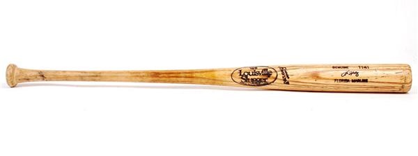 34" Louisville Slugger T141 model baseball bat game used by Tino Martinez while a Florida Marlin. The bat shows great use with pine tar on the handle and numerous ball and bat rack marks. Tino's #24 is written on the knob-end.