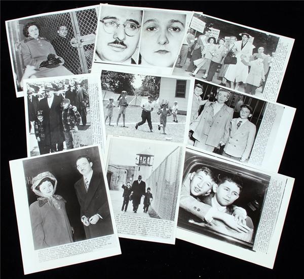 A collection of photos of the notorious A-Bomb spies Julius and Ethel Rosenberg who were executed in 1953 after being convicted of providing military secrets to Russia. The images capture the last days of Julius and Ethel’s life as well as multiple images of their sons in the days leading up to and after their execution. The collection also includes a photo of the brothers in 1979 at which time they were petitioning the Supreme Court and declaring their parents' innocence. The wire and non-wire photos range in size from 7”x9” to 9”x11” and are of excellent quality with minimal creasing and very few editorial markings.