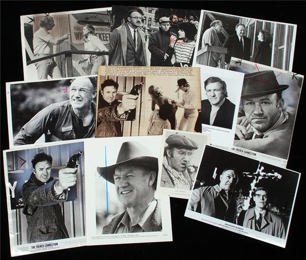 Incredible collection of Gene Hackman news service wire and studio photos (49). Photos are mostly 8" x 10" and are in varying conditions from VG-NRMT, many with newspaper edit marks. Includes shots from The French Connection, The Conversation, Night Moves, Narrow Margin, The Quick and the Dead, Bat 21, Lucky Lady, Mississippi Burning and The Firm among others. Photos show Hackman with other star actors such as Melanie Griffith, Willem DaFoe, Russell Crowe, Tom Cruise, Barbra Streisand, Liza Minnelli and Burt Reynolds.