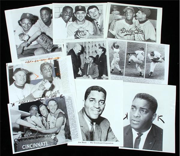 Joe Black was the first African American pitcher to win a World Series Game. He did it for the Brooklyn Dodgers in 1952. He was also 1952 NL Rookie of the Year. This collection of wire photos (13) is mostly 8" x 10" and average EX condition. They include some game action, family, post game and celebratory event shots.