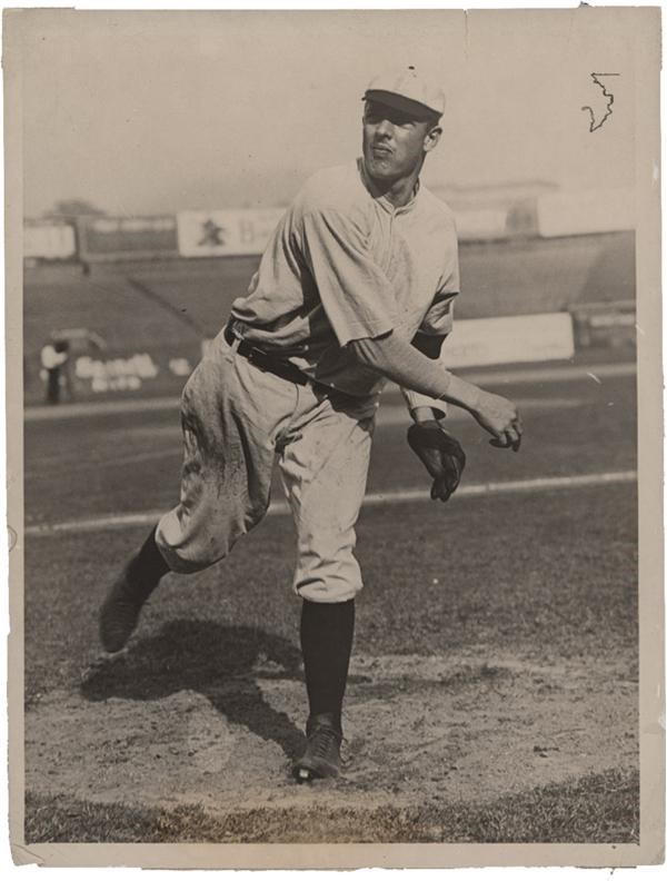 Photo of "first five" HOF pitcher Christy Mathewson shot in 1905. This is the year that he "won the series almost single handed" by pitching three shut out wins in four starts. This print was actually made in the 1920's by Keystone view (stamping on back). It is 6 1/2" x 8 1/2" and is in VG condition with a 1/2" tear along the top edge, a pen mark on the upper right corner and some discoloration along the bottom. Overall in really nice condition given its age. In 1936, Christy Mathewson was voted into the Baseball Hall of Fame as one of the famous "First Five" inductees, along with Babe Ruth, Ty Cobb, Walter Johnson and Honus Wagner.