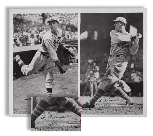 HOFer "Bucketfoot" Al Simmons hit for over .300 with 100+ RBI's for 11 consecutive seasons. He played on Connie Mack's 1929 World Champion Philadelphia A's, recognized as one of the all time greatest baseball teams. This 7" x 9" NRMT split screen photo features two shots, one of Simmons as a St. Louis Cardinal, the other as a Philadelphia Athletic. The latter side of the photo is signed in black steel tip fountain by the HOFer himself. Comes with JSA LOA.
