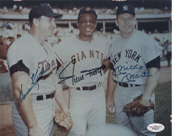 Great color photo of three of baseball's all time great players: sluggers Mickey Mantle of the Yankees, Willie Mays of the S.F. Giants and Harmon Killebrew of the Minnesota Twins. All three players are among the leading home run hitters of all time; Mays is 4th on the all time list, Killebrew is 9th and Mantle is 13th. Color 8" x 10" photo is signed by all three stars over their jersey's in blue fiber tip pen. Photo is EX with two 1" horizontal scrapes along the top edge. Comes with JSA LOA.