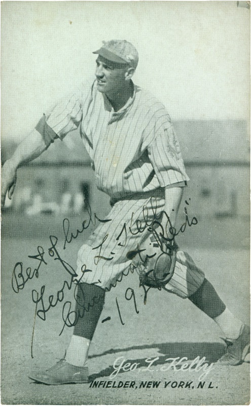 HOF 1st baseman George Kelly played most of his career with the New York Giants. The Giants with Kelly at 1st base won two World Series; in 1921 and 1922. He was the NL HR leader in 1921 and RBI leader in 1920 and 1924. This 3 1/4" x 5 1/2" 1921 NY Giants exhibit card has been signed "Best of luck George L. Kelly Cincinnati Reds-1928" by Kelly himself. Comes with COA from JSA.