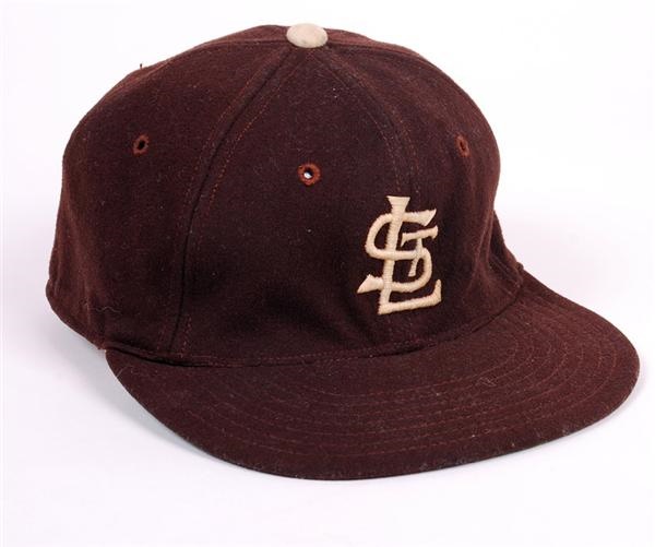 The St. Louis Browns had a little run of success during WWII when the league's best players were at war. Here is a great baseball relic from that era from a team that never quite captured the fans of St. Louis. This game used St. Louis Browns baseball cap comes from the 40's or early 50's. It has the number 18 written inside in three spots: twice in the sweatband and once inside the front. The wool fitted cap is a size 7 made by Tim McAuliffe Inc. It shows use with staining in the sweatband, but the hat itself is solid: the flannel has rich color and the bill is stiff.