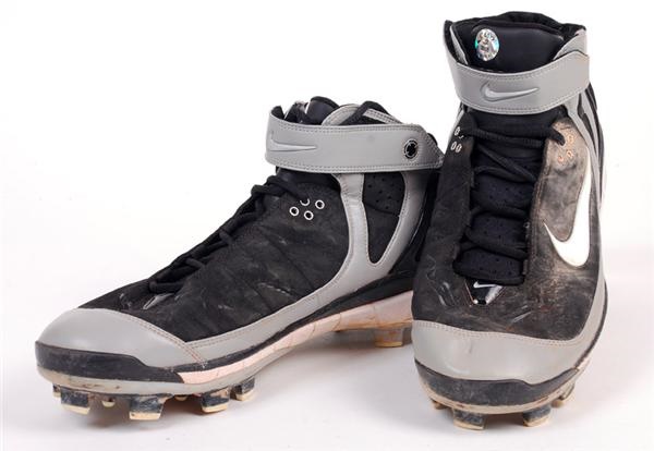 Robinson Cano, the young baseball player named after the great Jackie Robinson, is making a name for himself swinging the bat in NY. Here is a great pair of baseball cleats game used by Cano in 2006. These cleats have his original #22, which he gave up in 2007 in the event that the Yankees signed Roger Clemens. The size 13 Nike Huarache 2K5's show great use with infield dirt on the bottom and in the eyelet.