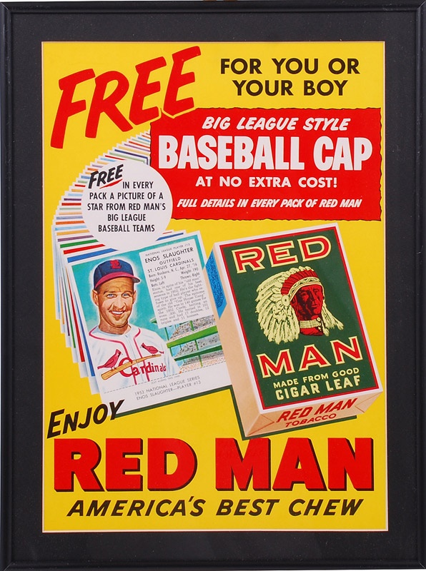 Vibrant, Red Man Tobacco ad pieces from 1955. The (2) baseball themed advertisements promote premiums: a baseball player photo in each pack and a mail-in offer for a free baseball cap. In one ad, the spokesman is Johnny Mize, the other shows Enos Slaughter. Framed to 13 x 17.5", both have incredible graphics and appear mint behind the glass.