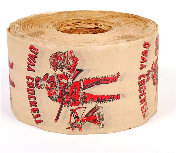 Large original roll of decals (probably over 1000), each with a colorful illustration of Crockett with mountain man outfit, gun and Indian shooting a bear in the background. Some water staining and edge wear. Since the piece has never been unrolled we are uncertain of the condition of the decals in the center. Should be overall VG or better with a few of the outer decals grading less.