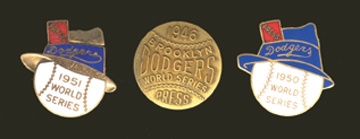 Three rare pins made for the Dodgers in anticipation to pennants they never won. Includes 1946, 1950 and 1951. Mint.
