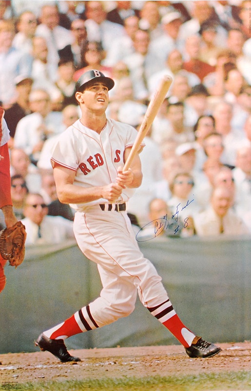 A youthful Yaz at the plate in the late 60's graces this large, Sports Illustrated poster. The Red Sox legend and baseball Hall of Famer has signed the poster in mint blue Sharpie with a "#8". Measuring 24 x 36.5", the EX/NM poster is mounted on foam core and ready for framing .