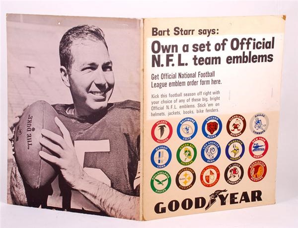 This two-panel advertising piece for Goodyear promotes an NFL emblem giveaway and the Green Bay Packers Illustrious QB, Bart Starr is their spokesman. The heavy cardboard display from the late 60's has the offered emblems on the right panel and a large (20 x 26") photo of the Pro Football Hall of Famer on the left. It has some overall toning of the paper and minor edge wear as well as a number of original cutouts for hanging the piece and for attaching order forms for the giveaway. This great example of early product endorsement is overall in VG+ condition.