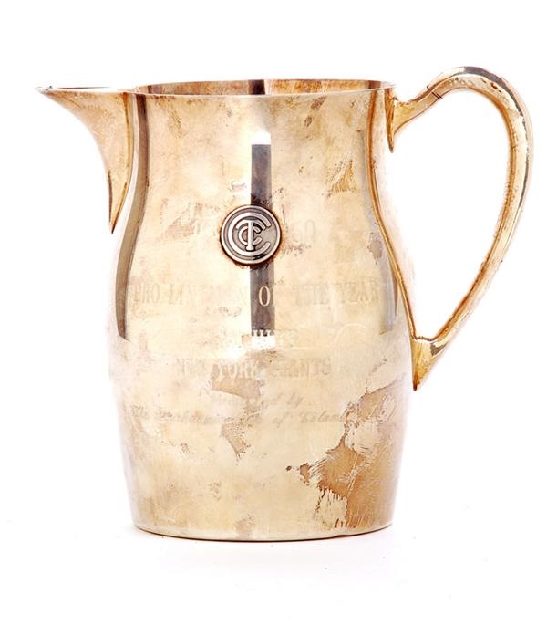 Sam Huff of The New York Football Giants won the “Pro Lineman of the Year” award presented by The Touchdown Club of Columbus in 1960. This silver engraved pitcher was given to Huff in recognition of this honor. It is approximately 8” in height by 8” in width and is in EX condition with some mild tarnishing on the silver finish.